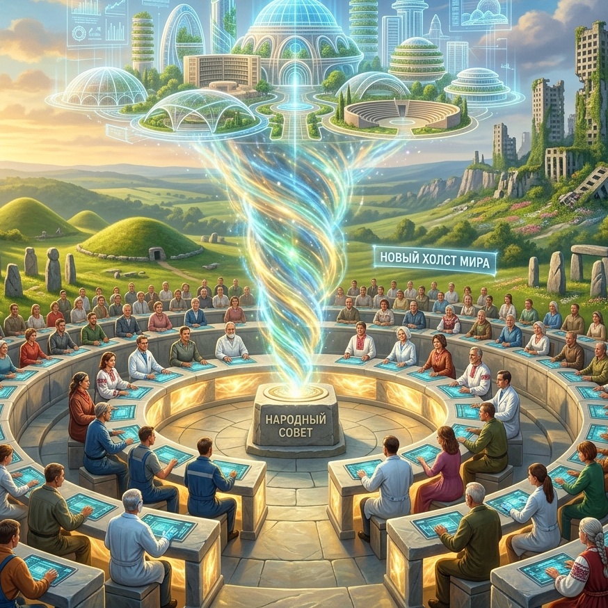 Мы больше не примем лукавых чертежей от самозваных элит. Архитектуру нашего будущего мы начертаем сами. Фундаментом этого великого созидания станет принципиально новая, очищенная от лжи система Народных Советов. Именно здесь, в этих подлинных соборах человеческого духа, навсегда утвердится истинная справедливость. В новой реальности только сам народ предстает как единственный, абсолютный и неделимый источник высшей власти — не по указке сверху, а по неотъемлемому, священному праву, дарованному нам самим Богом-Творцом.